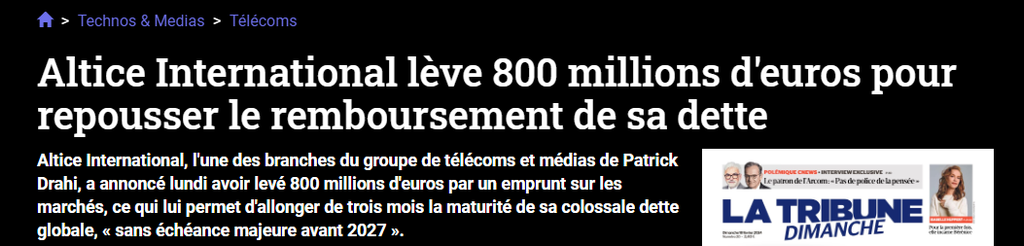 De l’argent frais et une façon de tester l’attitude des marchés à son égard . Altice International, une des trois grandes branche de l’empire des télécommunications et des médias de Patrick Drahi, annonce ce lundi avoir levé 800 millions d’euros sur les marchés financiers. Cette dette senior, à échéance 2027, lui permet d’allonger la maturité de sa dette sur cette entité regroupant ses activités au Portugal, en République Dominicaine, en Israël mais aussi la start-up de publicité digitale Teads. «Grâce à cette transaction, l'échéance moyenne de la structure du capital de la dette d'Altice International passe de 4,6 ans à 4,9 ans, contre 4,6 ans auparavant, sans échéance majeure avant 2027», se félicite ainsi le groupe de Patrick Drahi dans un communiqué.