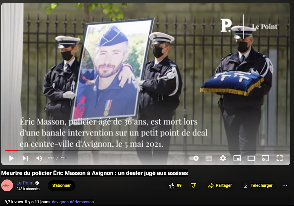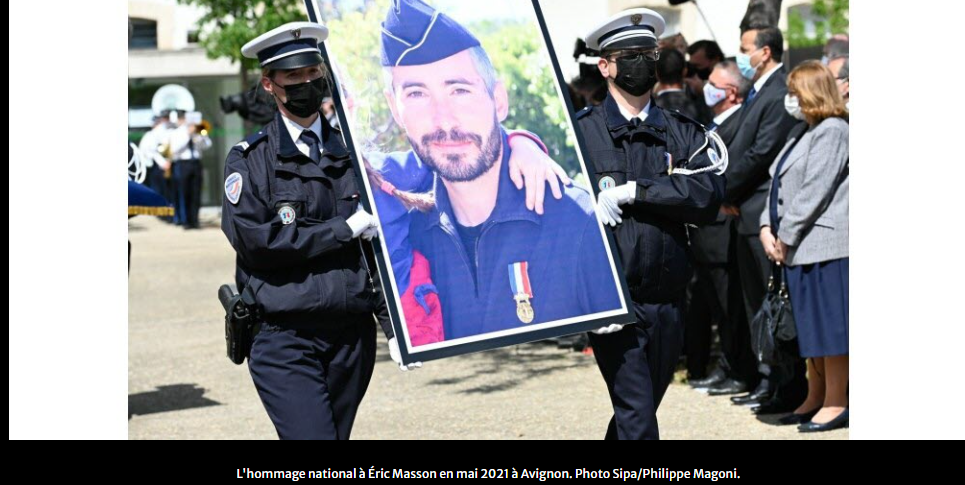 Son visage a marqué la profession. Éric Masson, policier âgé de 36 ans, est mort lors d'une banale intervention sur un petit point de deal en centre-ville d'Avignon, le 5 mai 2021. Son meurtrier présumé, Ilias A., est un dealer, aujourd'hui âgé de 23 ans. Accusé de « meurtre » et « tentative de meurtre » sur personne dépositaire de l'autorité publique, il sera défendu par maître Franck Berton à la cour d'assises d'Avignon, où son procès s'ouvre ce lundi.