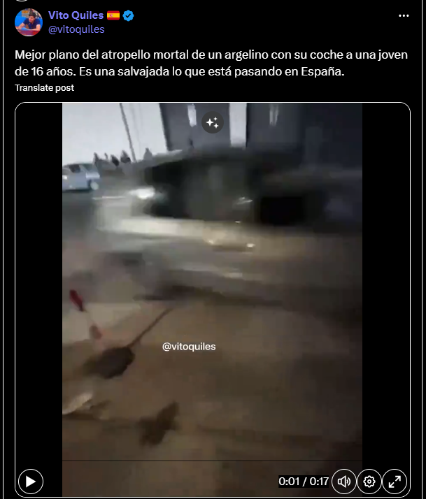 Meilleur plan de l'attaque mortelle d'un Algérien avec sa voiture contre une jeune fille de 16 ans. Ce qui se passe en Espagne est barbare.
