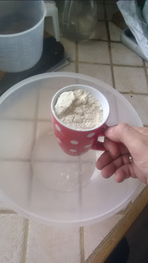 on va faire un dosage très simple : 3 tasses de farine pour 1 tasse et demi d'eau