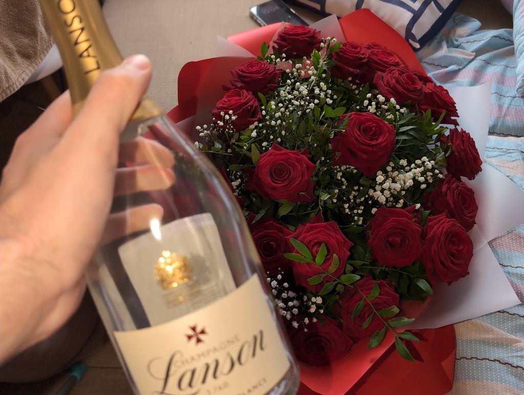 45 euros le bouquet + 140 euros la bouteille de champange + 10 euros une pizza ahi.
