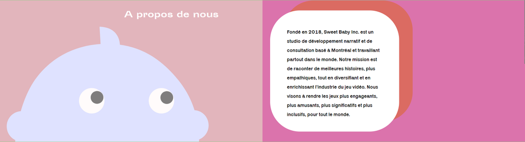 "Fondé en 2018, Sweet Baby Inc. est un studio de développement narratif et de consultation basé à Montréal et travaillant partout dans le monde. Notre mission est de raconter de meilleures histoires, plus empathiques, tout en diversifiant et en enrichissant l’industrie du jeu vidéo. Nous visons à rendre les jeux plus engageants, plus amusants, plus significatifs et plus inclusifs, pour tout le monde."