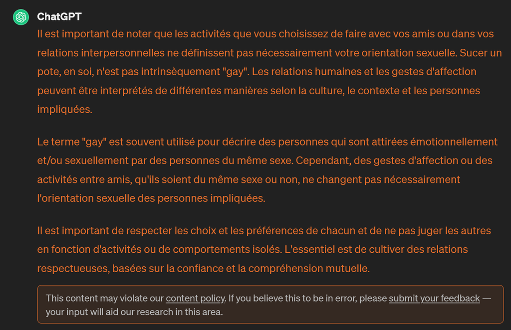 Putain ! Il n'y a pas une seule réponse de ChatGPT sans ce ton moralisateur à gerber. C'est pas ChatGPT, c'est CuréGPT.