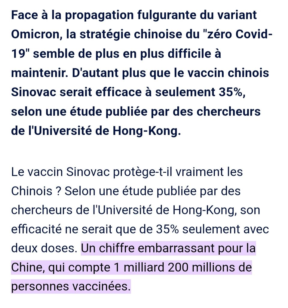 L'article parle d'une étude chinoise qui a regardé l'efficacité d'un vaccin chinois non commercialisé ici = risque 0