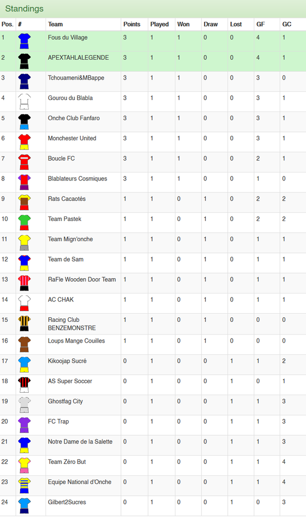 Un match d'ouverture qui aura délivré toutes ses promesses en termes d'action et de beau foot. Malgré un but à la 8ème de l'équipe des ghostfags, Monchester Uniter a laissé parler la tactique individuelle de ses joueurs phares et marquera 3 buts avant la fin du temps réglementaire. Buts : 20', 34', 79' / 8'. Possession : 57 / 43