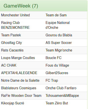 Les blablateurs perden tpied en ce jour face a l'un des favoris de cette compétition. Malgré une première période difficile, les Bleus ne perdent pas la face et sécurisent la victoire en seconde période avec deux buts et gardent plus que jamais une place bien chaude dans le podium de la Ligue Onche. Buts : 61', 86' / 31'; Possession : 61 / 39