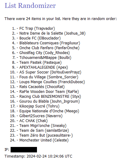 Même exact fonctionnement que la dernière fois les craies : 4 équipes au hasard vont reçevoir un point bonus d'attaque ou de défense, et 4 équipes vont perdre un point de bonus ou de défense. Pour ce faire, j'ai copié la liste des équipes dans l'ordre du classement et je l'ai mise dans un randomizer en ligne. Les 4 équipes du haut gagnent un point, les 4 équipes du bas perdent un point.