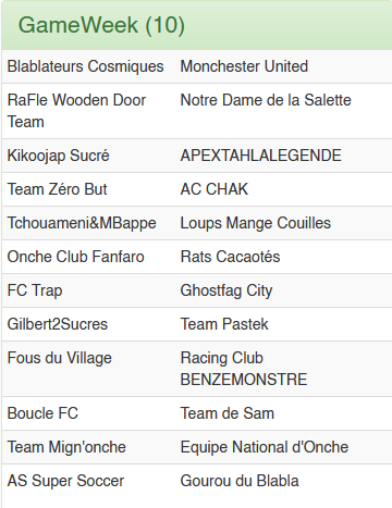 Je compte sur toi pour gagner la compétition perso je pressens que mon équipe est hors du coup d'autant plus qu'elle a perdu son avantage lié au bonus d'attaque par un malus de défense, je souhaite à ton équipe d'être forte et courageuse face à des terrifiants adversaires comme le FC boucle ou le Tchoumeni M'bappe et attention au FC trap menée de main de fer par la terrifiante Marie Quintero qui risque de remonter dans le classement brutalement après leur double bonus, toutes ces équipes ne reculerons devant rien pour arracher la coupe il faut qu'on croit en l'âme du ballon et au pouvoir du blabla et de l'amitié de toutes nos forces