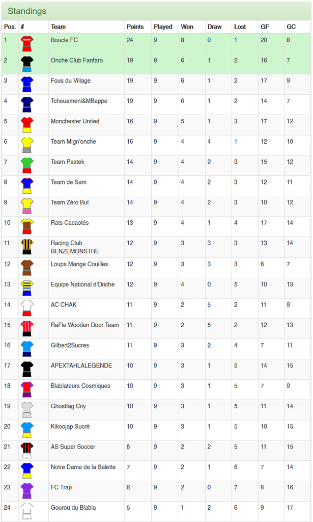 Quelle semaine ! Le combat pour la 1ere place fut spectaculaire, mais c'est bien le Boucle FC qui domine cette compétition d'une main de fer avec 5 points d'avance sur les 3 deuxièmes ex-aequo. Les boucleurs sont l'équipe à abattre, coute que coute. :Zidane_Roulade: