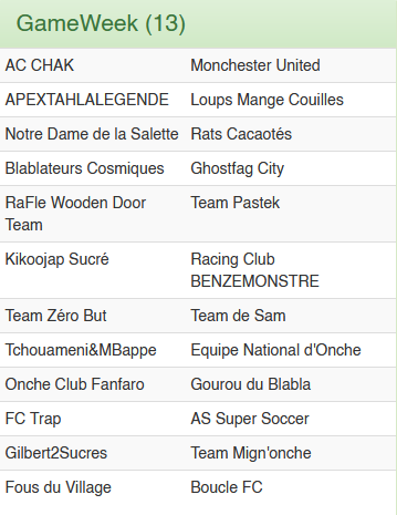 Encore un match fou en cette 12eme journée. Les derniers ex-aequo battent les fous du village dans une remontada de fin de match qui donnerait des traumatismes à une certaine équipe parisienne. Une victoire qui fait plaisir chez les sectaires tandis que les FDV vont devoir chercher a comprendre ou est-ce qu'ils ont bien pu fauter. Buts : 67', 80' / 29'. Possession : 56 / 44