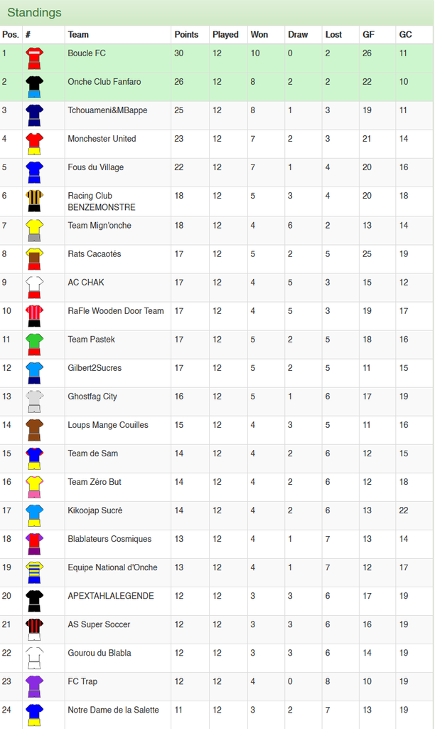 Nous atteignons officiellement la MOITIÉ de cette Ligue Onche. Il reste 11 matchs par équipe a disputer hors de la grande finale et donc 33 points potentiels à gagner pour chaque équipe. Cela signifie également que très vite, les équipes les plus en bas du classement ne pourront plus mathématiquement gagner la Ligue Onche même si elles réalisent un score parfait. Je vous tiendrais informé par rapport à tout cela bien sur... Mais en attendant, le résumax de la 12eme journée.