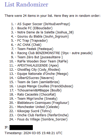 8 équipes au hasard vont recevoir un point bonus d'attaque ou de défense, et 8 équipes vont perdre un point de bonus ou de défense. Pour ce faire, j'ai copié la liste des équipes dans l'ordre du classement et je l'ai mise dans un randomizer en ligne. Les 8 équipes du haut gagnent un point, les 8 équipes du bas perdent un point.