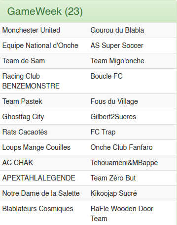 C'est désormais une certitude, malgré leur défaite aujourd'hui, le Boucle FC FINIRA A COUP SUR PREMIER DU CLASSEMENT DE LA LIGUE ONCHE. Cela ne leur vaudra cependant pas le Titre puisqu'il sera joué en finale ce vendredi à 20h. Quant à la deuxième place, elle reste jouable pour 3 équipes, n'importe laquelle peut s'en sortir demain et créer la surprise, même si ce sera plus difficile pour certains que pour d'autres. Putain les kheys j'ai tellement hate de voir les matchs de demain!
