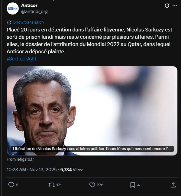 Anticor @anticor_org Placé 20 jours en détention dans l’affaire libyenne, Nicolas Sarkozy est sorti de prison lundi mais reste concerné par plusieurs affaires. Parmi elles, le dossier de l'attribution du Mondial 2022 au Qatar, dans lequel Anticor a déposé plainte.