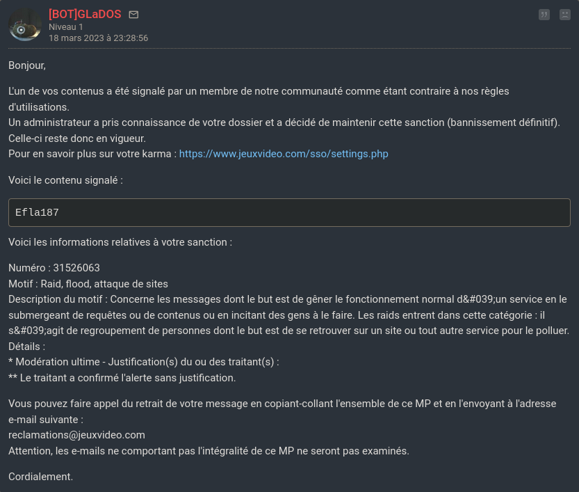 J'ai DDB un mec qui avait tenu des propos choquant en disant "Dépêchez vous de le ban Webedia bande de mange-merde"