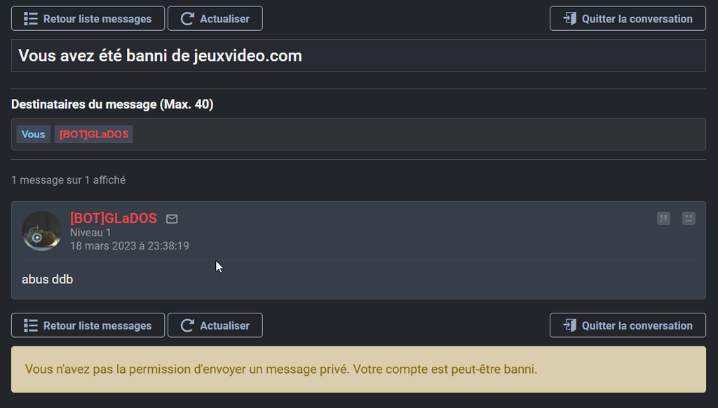ahi je viens de DDB un mec et j'étais même pas méchant, mais je suis fait ban def comme ça:
