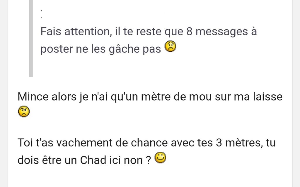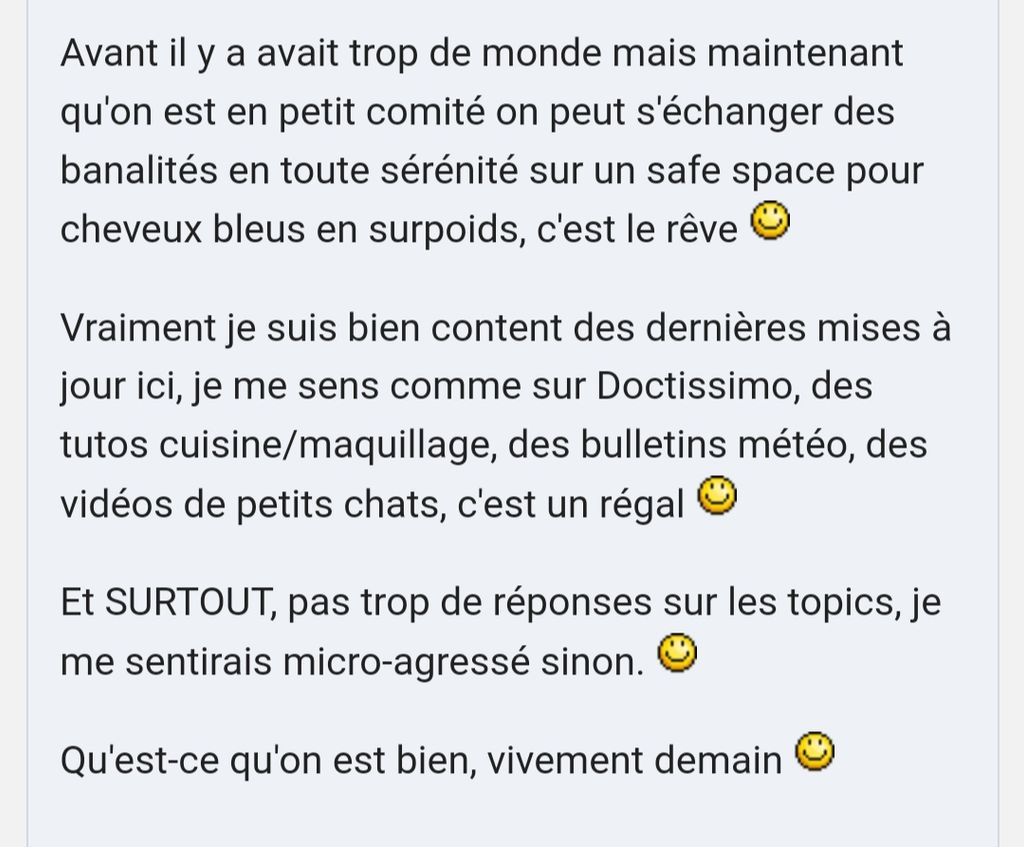 Par contre ici y’en a vraiment qui sont encore sur le forum ? Vous avez pas honte sérieusement ? J’y ai pas foutu une seule fois les pieds, l’idée ne m’est même pas venue à l’esprit depuis qu’on est ici