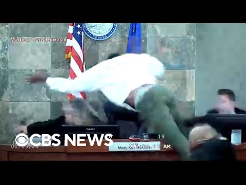 A man who was seen on camera leaping over the bench to attack a judge in a Las Vegas courtroom was hit with new charges Thursday. Carter Evans has the latest.