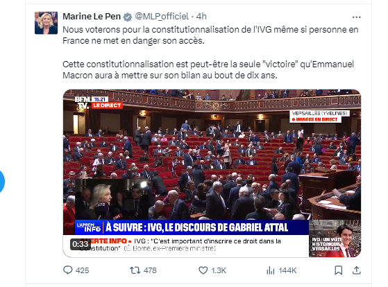 ALERTE : réaction du parti n°1 d'oppostion >> MLP dit que si elle arrive au pouvoir elle annulera cette inscription de l IVG dans la constitution