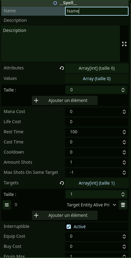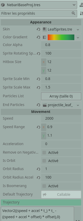 Ce ProjectileProperty on le définit exactement comme le CharacterBase. On crée la ressource avec tous les paramètres listés: