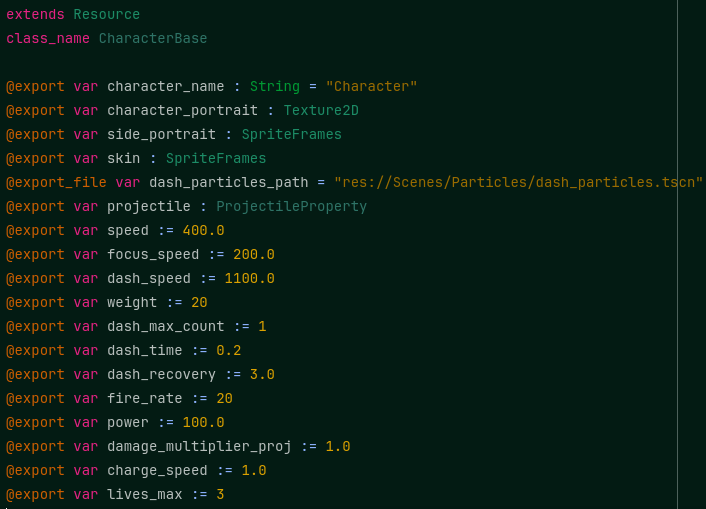 - Les stats et informations de base des Personnages sont contenues dans des Resources de type "CharacterBase". Vraiment c'est juste un gros pack de variables ici: