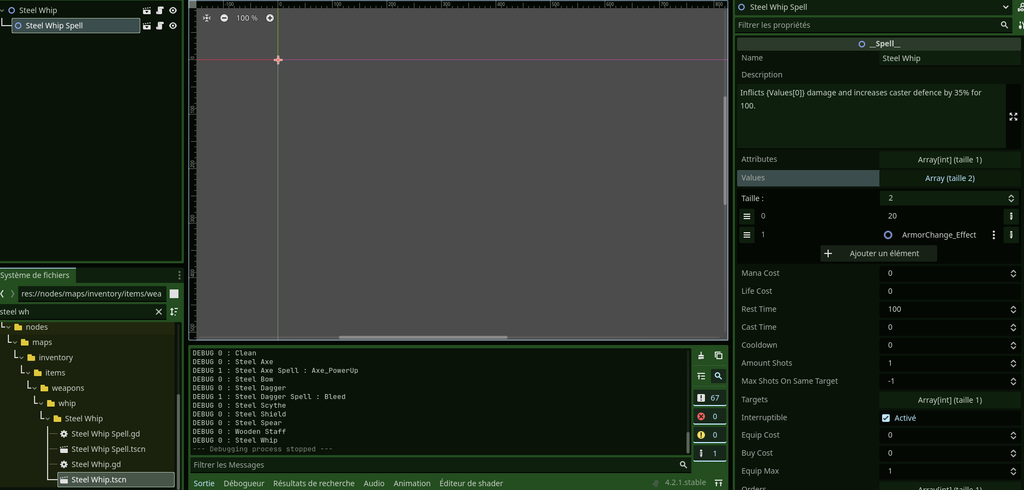-> Dans quelques cas, ce sort possède une référence à un effet (qui est aussi une autre scene mais placé en tant qu'enfant du spell également), qui est initialement un Nodepath (oblige car c'est dans un @export Array pour simplifier ailleurs), qui est set au vrai Node dans le _ready du spell
