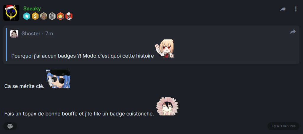 Les badges c'est bon délire, aucun privilège ou quoi c'est juste une question de montrer que t'appartirns à ici