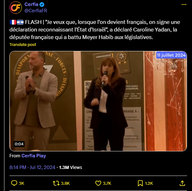 🇫🇷🇮🇱 FLASH | "Je veux que, lorsque l'on devient français, on signe une déclaration reconnaissant l'État d'Israël", a déclaré Caroline Yadan, la députée française qui a battu Meyer Habib aux législatives.