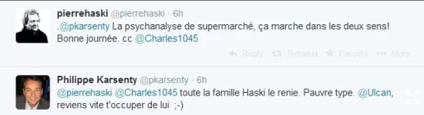 C'est de là qu'est parti l'échange de tweets, s'envenimant progressivement jusqu'à ce que Philippe Karsenty appelle Ulcan à la rescousse, et écrive que le père de Pierre Haski avait "bien fait de l'abandonner"...