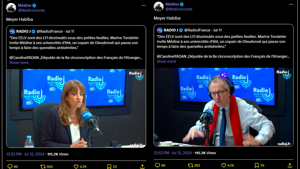 "Des EELV sont des LFI dissimulés sous des petites feuilles. Marine Tondelier invite Médine à ses universités d’été, un copain de Dieudonné qui passe son temps à faire des quenelles antisémites."