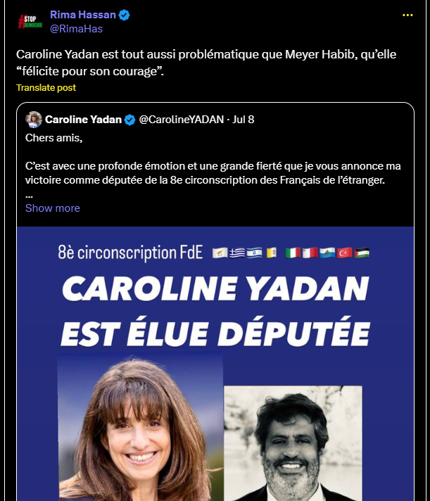 Caroline Yadan est tout aussi problématique que Meyer Habib, qu’elle “félicite pour son courage”.