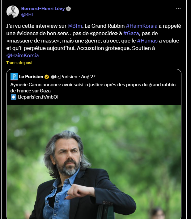 . Le Grand Rabbin #HaimKorsia a rappelé une évidence de bon sens : pas de «genocide» à #Gaza, pas de «massacre de masse», mais une guerre, atroce, que le #Hamas a voulue et qu’il perpétue aujourd’hui. Accusation grotesque. Soutien à @HaimKorsia.