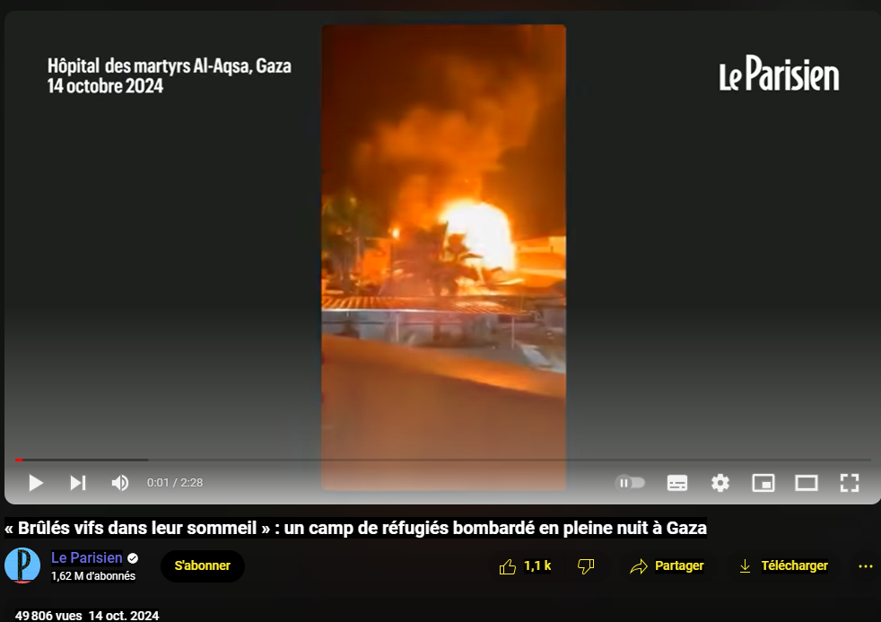 Autour d'une heure du matin à à Deir Al-Balah dans le centre de Gaza, des frappes israéliennes provoquent un incendie meurtrier dans la cour de l'hôpital d'Al-Aqsa qui abrite des déplacés gazaouis. Des Palestiniens sont brûlés vifs dans leur sommeil.