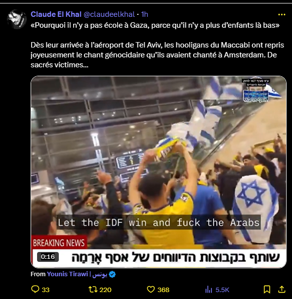 Dès leur arrivée à l’aéroport de Tel Aviv, les hooligans du Maccabi ont repris joyeusement le chant génocidaire qu’ils avaient chanté à Amsterdam. De sacrés victimes…