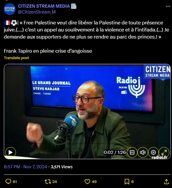 🇫🇷⚽️| « Free Palestine veut dire libérer la Palestine de toute présence juive.(….) c’est un appel au soulèvement à la violence et à l’intifada.(…) Je demande aux supporters de ne plus se rendre au parc des princes.! »