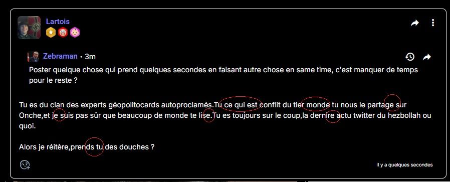 Tu es du clan des experts géopolitocards autoproclamés.Tu ce qui est conflit du tier monde tu nous le partage sur Onche,et je suis pas sûr que beaucoup de monde te lise.Tu es toujours sur le coup,la dernire actu twitter du hezbollah ou quoi.