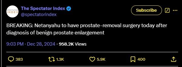 URGENT : Netanyahu subira aujourd'hui une intervention chirurgicale pour l'ablation de la prostate après un diagnostic d'hypertrophie bénigne de la prostate.