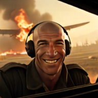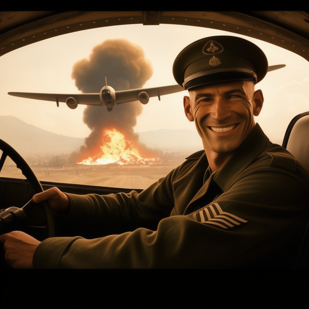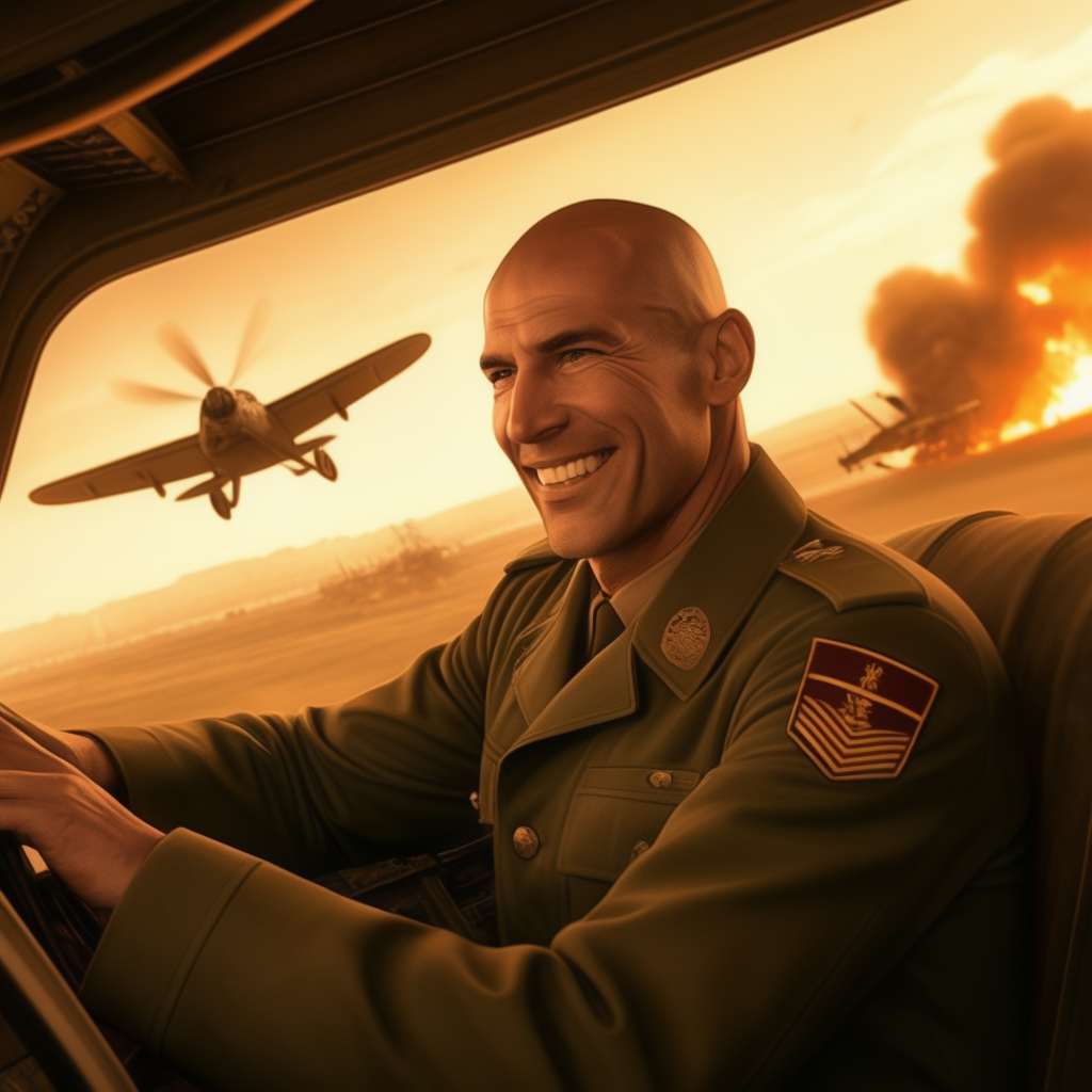 Zidane is wearing a very old German war uniform is smiling he is driving a bomber military plane. A temple is burning in the background