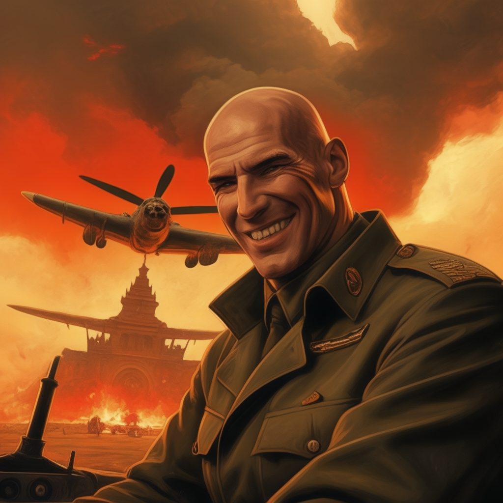 Zidane is wearing a very old German war uniform is smiling he is driving a bomber military plane. A huge and demoniac looking temple is burning in the background, a man with a big nose is crying at the bottom of the temple