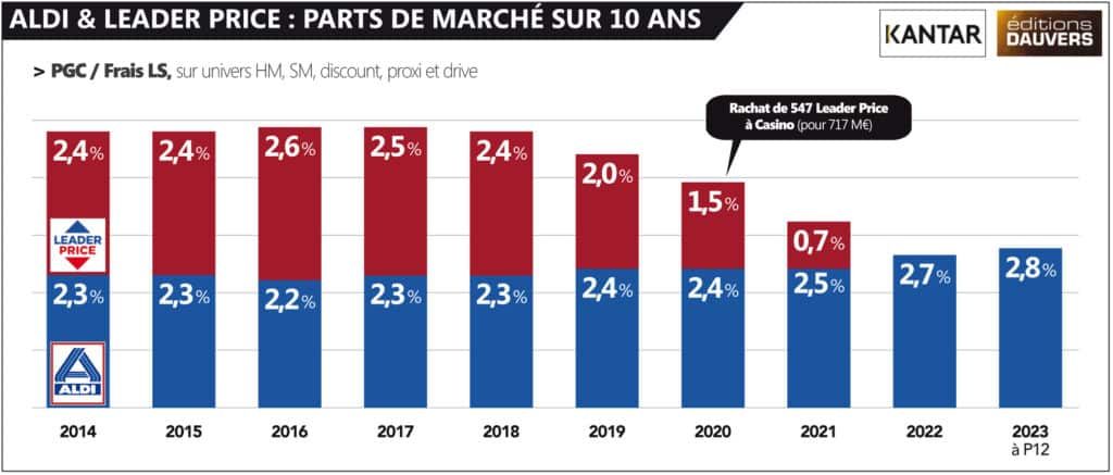 Exemple ici avec Aldi, voilà 3 ans qu'ils ont racheté les 547 Leader Price du groupe Casino, dans le but de rattraper leur retard sur Lidl. Ces mongoles pensaient qu'ils allaient absorber toutes les parts de marché (PDM) de ces magasins, mais il n'en n'est rien comme vous pouvez le voir aujourd'hui :