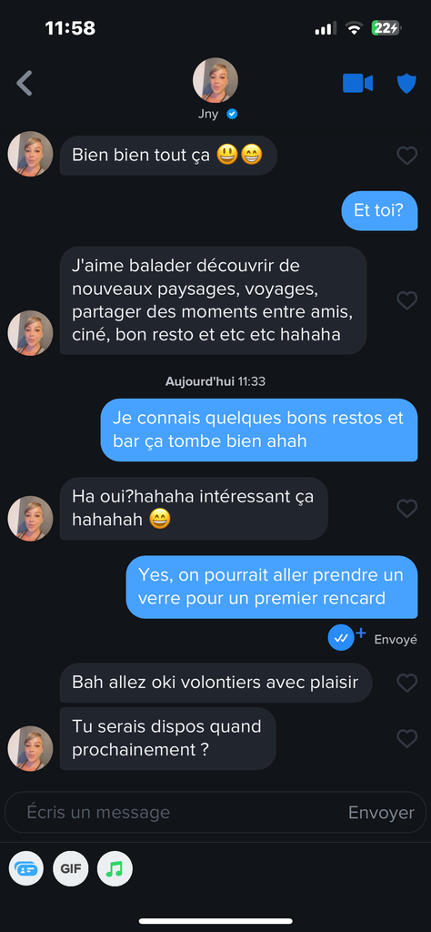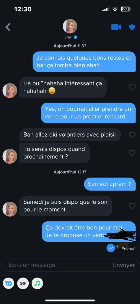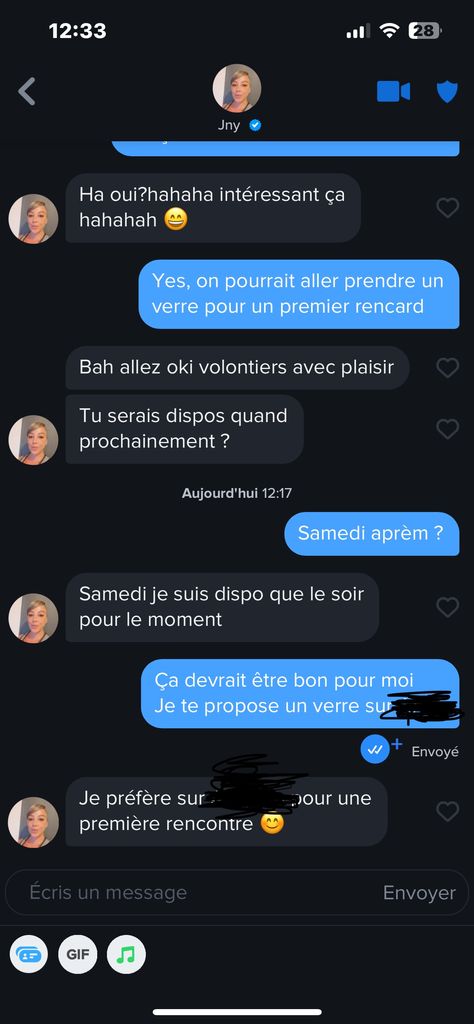 Je lui propose un verre samedi aprem, j'attends sa réponse, ensuite je lui propose un bar dans ma ville, et là on va commencer à marquer des points les kheys