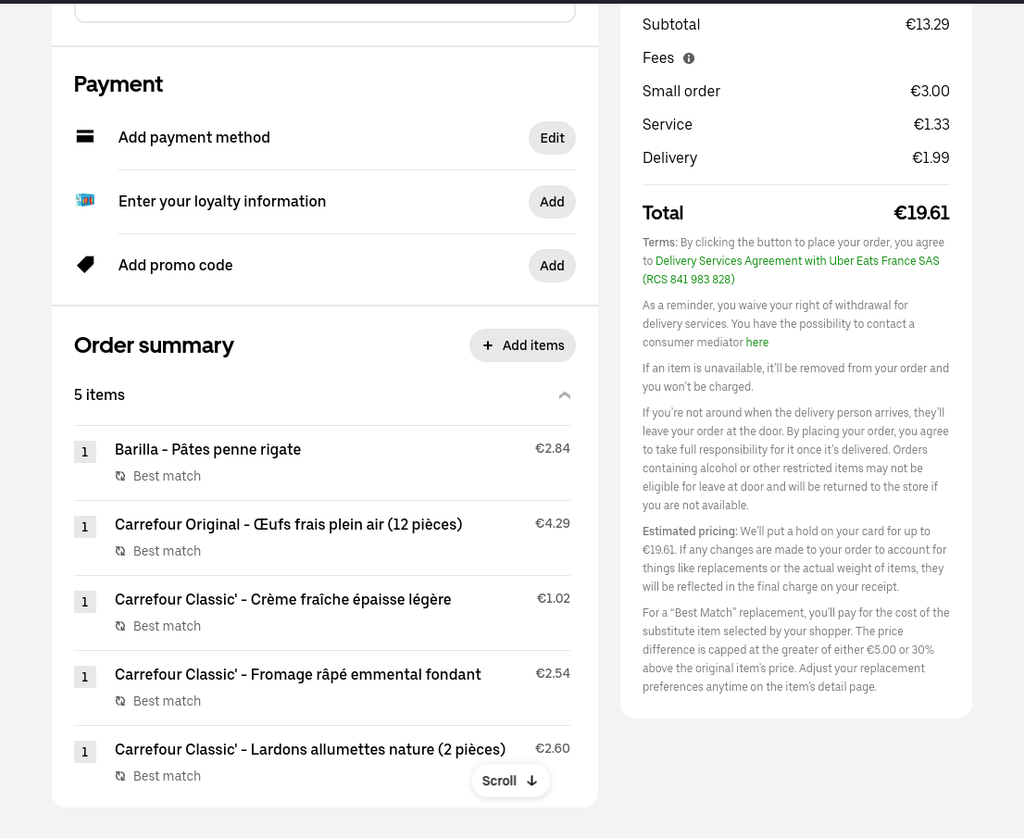 on ajoute le petit toppers Extra emmental râpé pour avoir comme sur la photo et le petit toppers Extra jambon blanc pour faire le plein de protéines et on est déjà à 13e90 puis en ajoutant les frais de services et les frais de livraison on arrive facilement à 20euros :lebossgraisse2Velorev: