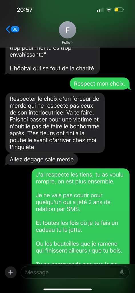 C’est elle qui m’a quitté par sms y a quelques jours après 2 ans de relation, j’ai accepté la rupture mais elle continue de me parler comme ci on étaient ensemble mais voulait plus me voir ni m’appeler donc j’ai envoyé le pavé du premier screen et elle a pete un plomb toute seule