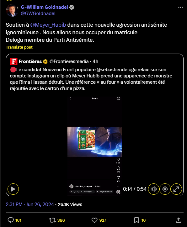 🔴Le candidat Nouveau Front populaire @sebastiendelogu relaie sur son compte Instagram un clip où Meyer Habib prend une apparence de monstre que Rima Hassan détruit. Une référence « au four » a volontairement été rajoutée avec le carton d’une pizza.