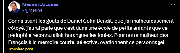 Connaissant les gouts de Daniel Cohn Bendit, que j'ai malheureusement côtoyé, j'aurai parié que c'est dans une école de petits enfants que ce pédophile reconnu allait haranguer les foules. Pour notre malheur des Français à la mémoire courte, sélective, ovationnent ce personnage!