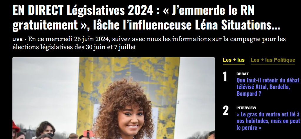EN DIRECT Législatives 2024 : « J’emmerde le RN gratuitement », lâche l’influenceuse Léna Situations...