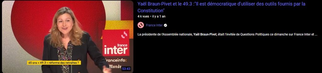 La présidente de l'Assemblée nationale, Yaël Braun-Pivet, était l'invitée de Questions Politiques ce dimanche sur France Inter et Franceinfo. Elle est revenue notamment sur la réforme des retraites, sur le climat de tensions à l'Assemblée nationale et sur les recours à l'article 49.3