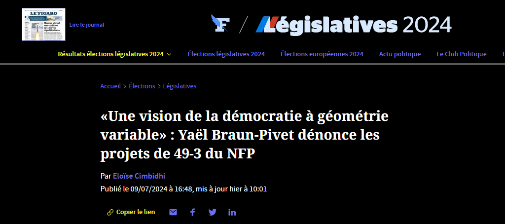 «Une vision de la démocratie à géométrie variable» : Yaël Braun-Pivet dénonce les projets de 49-3 du NFP. La présidente sortante de l'Assemblée nationale estime qu'«il faut respecter le Parlement». En l'absence de majorité absolue à l'Assemblée nationale, les tractations pour Matignon continuent d'aller bon train. il y a 2 jours