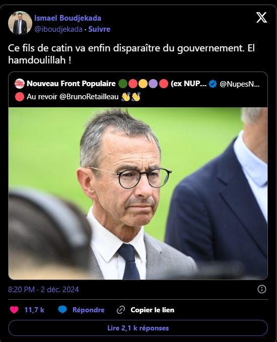 Ismaël Boudjekada, dans une publication, l’élu municipal d’opposition de la commune de Grand Charmont (Doubs), âgé de 29 ans, se félicite de la possible chute du gouvernement et plus spécifiquement de celle du ministre de l’Intérieur, Bruno Retailleau. «Ce fils de catin va enfin disparaître du gouvernement. El hamdoulillah («Dieu soit loué», ndlr) », a-t-il écrit sur X, en légende d’un post du NFP.