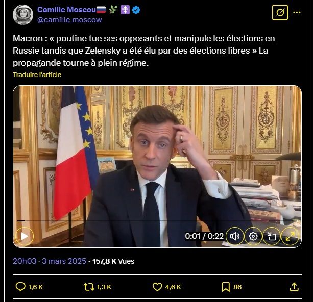 Macron : « poutine tue ses opposants et manipule les élections en Russie tandis que Zelensky a été élu par des élections libres » La propagande tourne à plein régime.
